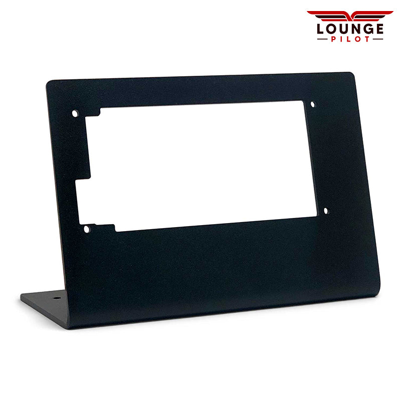 Desktop stand for the RealSimGear GTN650. Crafted from 3mm steel, powder-coated in matte black, and equipped with rubber non-slip feet and mounting screws. This stand offers a stable, elevated mounting position for the GTN650.